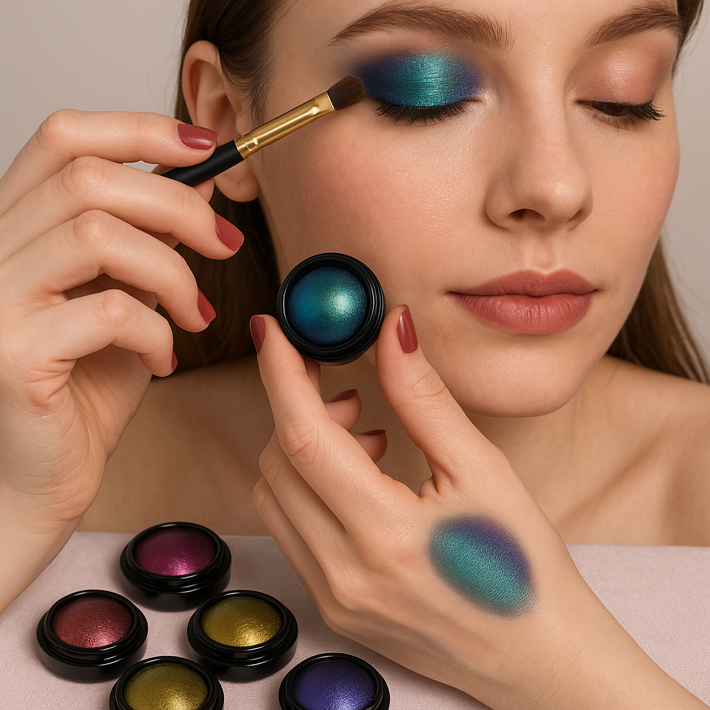 Notre fard à paupières caméléon est spécialement formulé avec des pigments innovants qui réagissent à la lumière et aux mouvements pour créer des teintes uniques et changeantes. Chaque nuance se fond harmonieusement avec votre peau, vous offrant un éclat magnétique et envoûtant à chaque application.